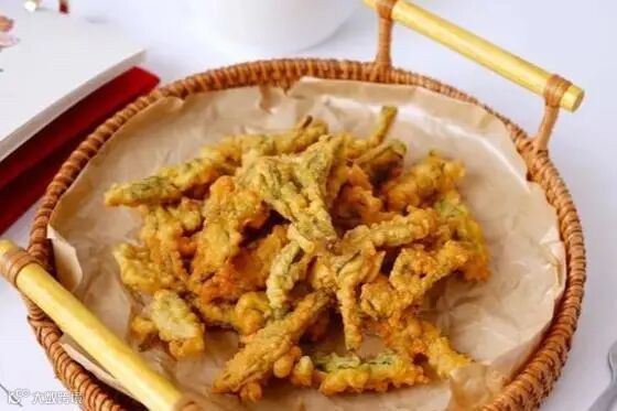 5、锅内加油烧至六成热,将沾了面糊的香椿入锅中开始炸至表面发焦控油捞出。
