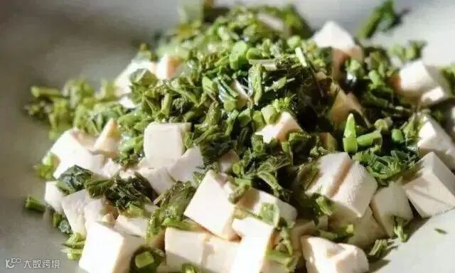 1、香椿洗净,去除根部,切成约1厘米长的小段焯水后备用。