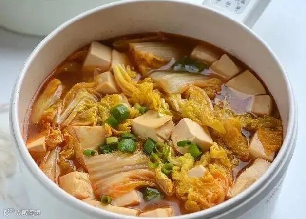 3、倒一大碗热水,将豆腐入锅,盖盖子大火焖煮5分钟,将娃娃菜的叶子入锅,变软变色即关火,撒上香葱末,端上桌开吃喽。