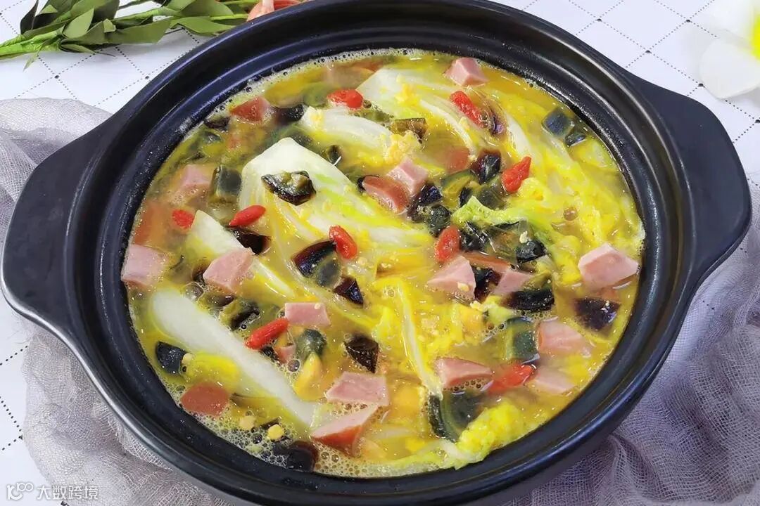 3、下入盐,蚝油,白胡椒粉调味,下入娃娃菜煮熟后捞出装盘,下入火腿,皮蛋丁,烧个20秒即可,连汤全部倒入,撒上泡好的枸杞即可。