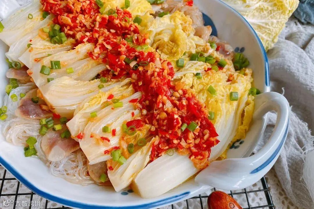 6、将粉丝放在娃娃菜上,并倒入炒好的蒜蓉辣椒末,即可上桌食用。