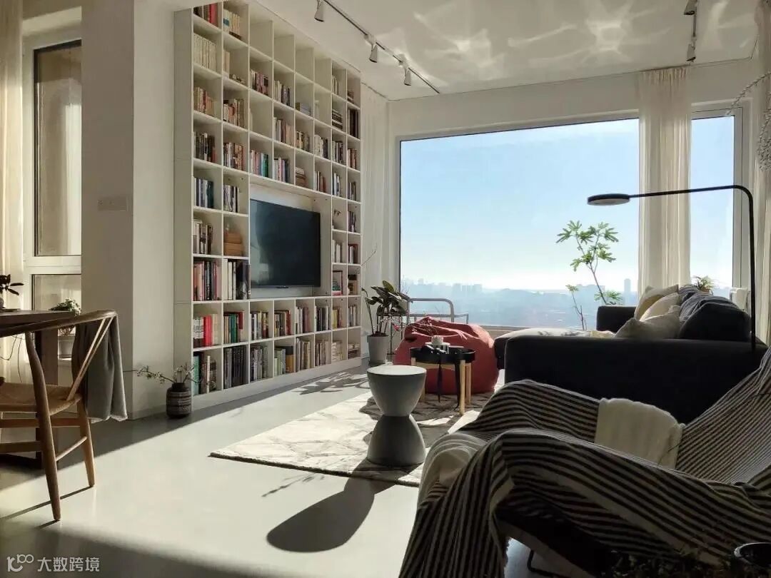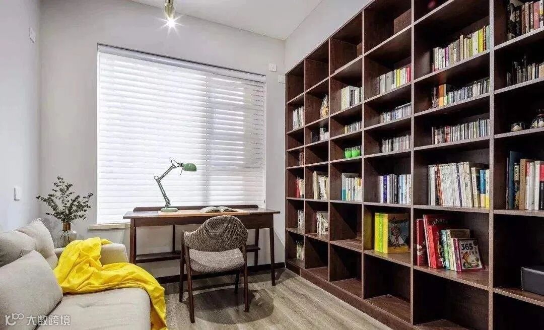 或是更加干脆,直接把墙面换成书柜,一面顶天立地的书柜,随随便便收纳几百本书,不成问题。