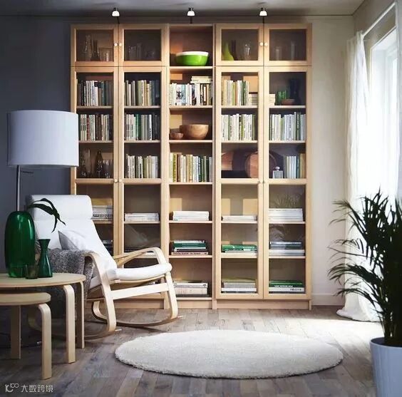 这样的书柜我更推荐买成品,而非定制,因为带玻璃柜门的书柜做起来会比较难,你家木工师傅可能会拒绝。