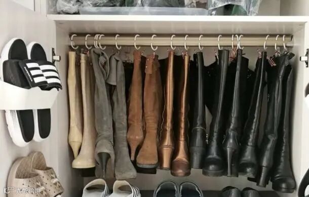 既不会让靴子变形,又不会损伤靴子表面,靴子原本穿的褶皱还能因为悬挂而恢复,对于喜欢穿靴子的女士来说,这样收纳实在太妙了。