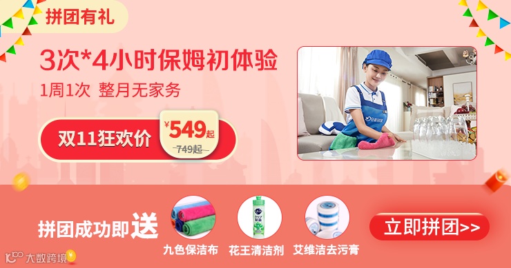 保洁/保姆双11限时体验,邀请好友一起买更优惠。拼团成功即赠送价值171元的清洁三宝—九色保洁布+花王清洁剂+进口去污膏