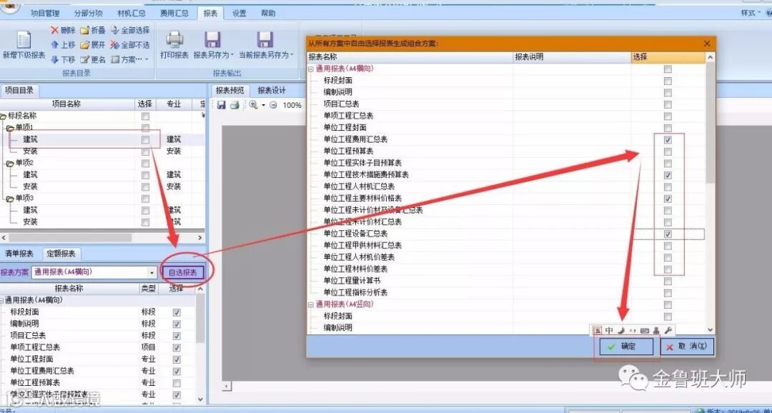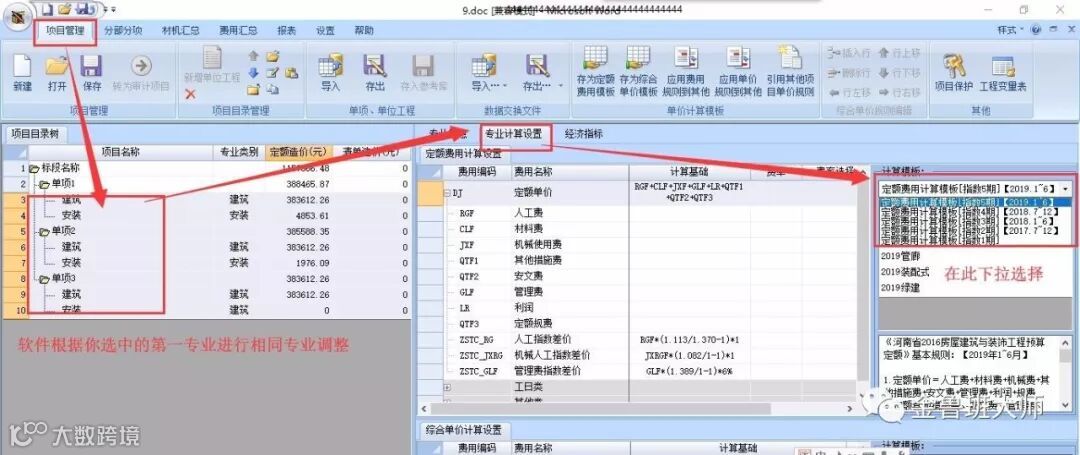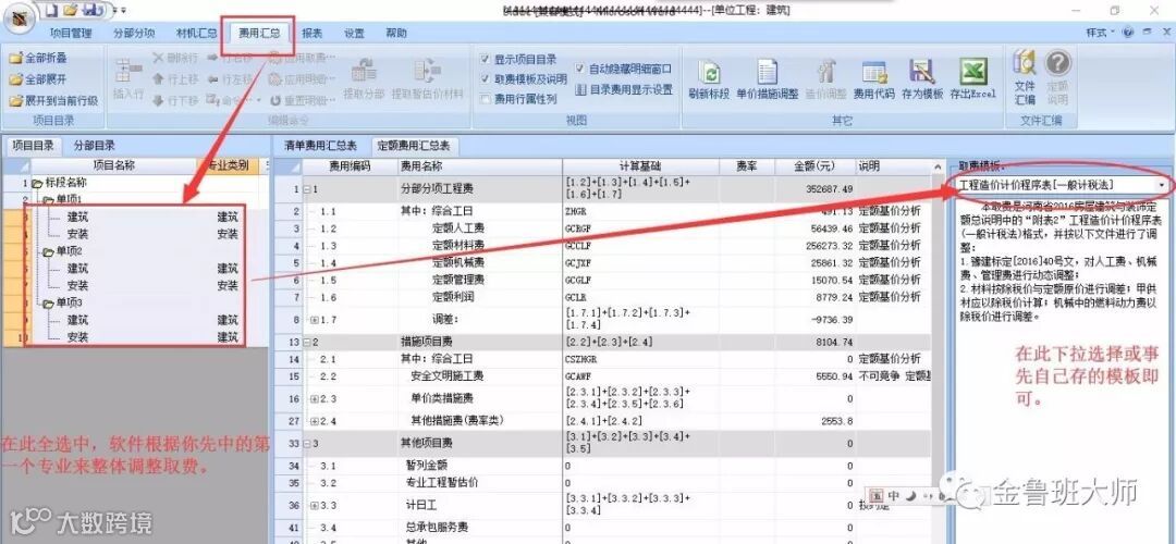 五、统一选取费,根据下图选择,软件是根据你选中的第一个专业,去统一调整你选中的第一个预算的专业去整体调整取费。