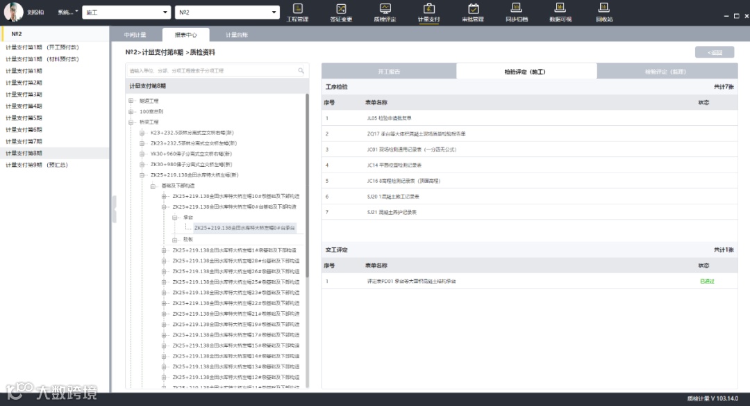 统一WBS结构树:质检、变更、计量采用同一棵WBS划分,质检资料线上填写完成之后同步推送到计量支付模块,方便管理者审查分项节点质检资料完成情况,提高了计量审查管理工作效率。