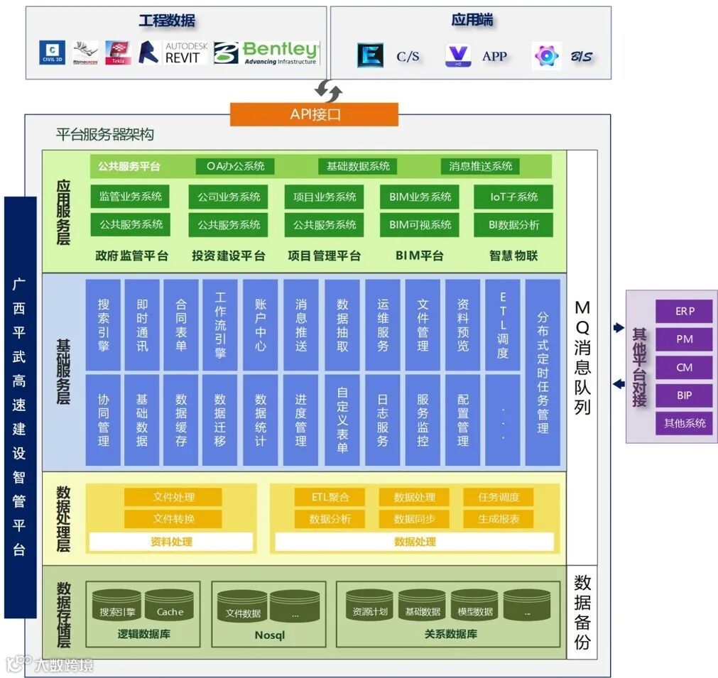 应用服务层按照业务进行平行、垂直拆分,各服务层平行共用公共平台服务,其余服务分为政府监管平台、投资集团平台、项目建设平台、BIM平台及智慧工地。