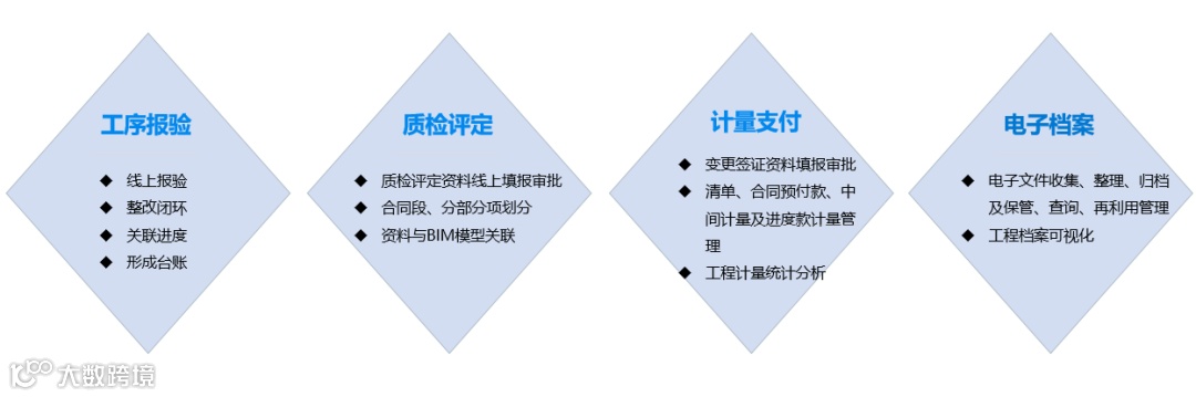 业务系统应用层实现项目过程管理,比如质量、安全、质检、计量、投资、甲供材料等,并结合现场硬件实现部分数据采集,比如试验室联网数据进入质检资料。