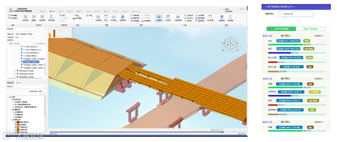通过BIM模型将工程施工过程中的台账跟BIM模型构件关联,形成基于BIM技术的4D工程管理,实现工程进度的三维形象展示。