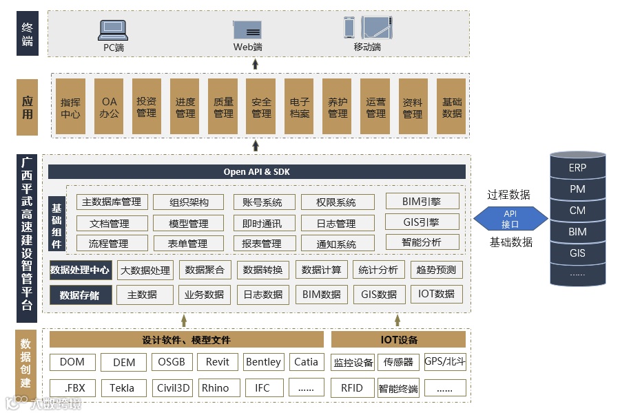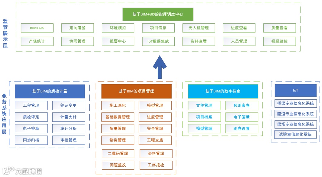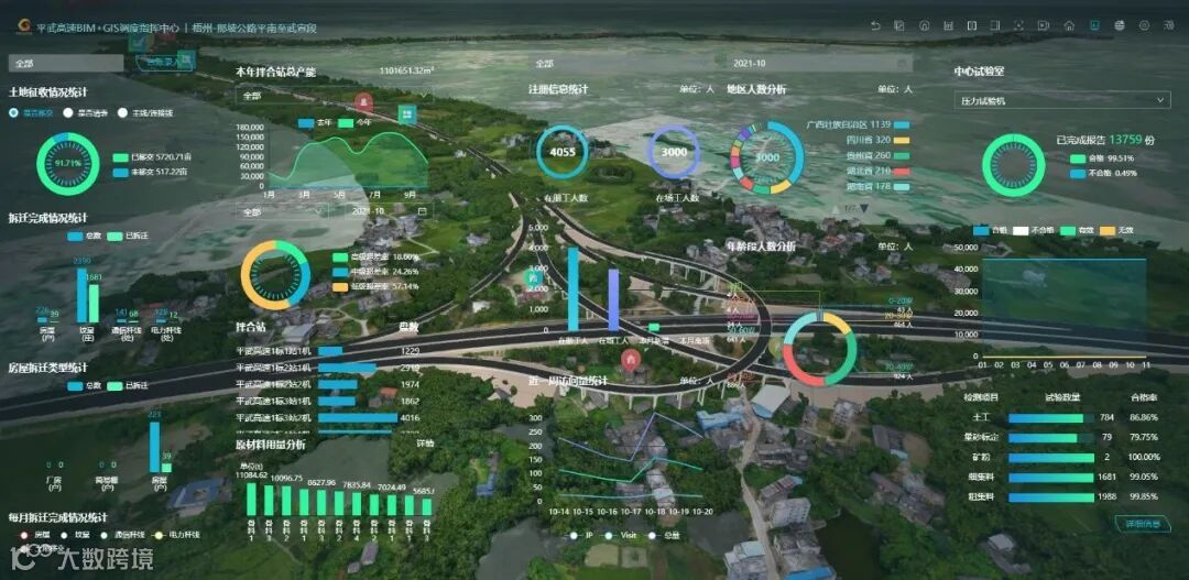 通过BIM+GIS物联网云计算等技术及业务流程一体化管理构建信息化大平台,将质量、安全、征地拆迁、智慧工地、数字化施工等信息化系统数据进行集成,建立一套基于BIM高速公路项目建设质量、安全、进度、投资等核心业务的统一数字化和智能化管控系统,形成工程模型大数据