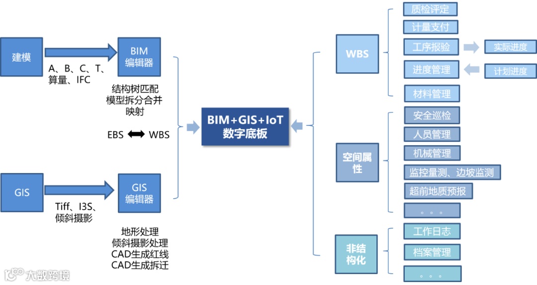 以工程分部分项划分WBS与工程BIM的实体结构分解EBS相互关联映射为基础,结合智慧物联的IoT,形成工程全生命周期管理的BIM+GIS+IoT数字底板。