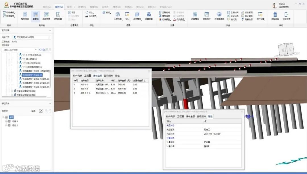 通过打通BIM平台与质检计量平台的数据关系,将质检资料关联到模型构件上,只要选择查看组查看构件信息,就能够查看到该构件组的工程量、清单金额、质检资料已经计量情况。