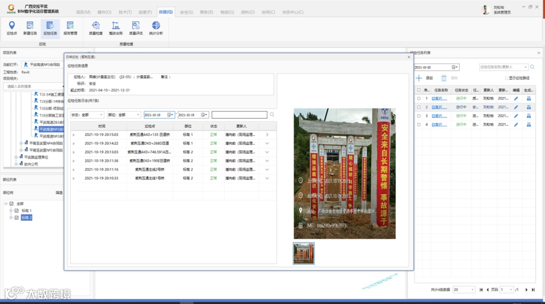 将工程施工过程中对于现场安全、质量、进度等工作,通过BIM模型创建巡检点和巡检任务,以手机“打卡”形式进行巡检,对于巡检异常的可以直接发起质量、安全检查,从而保证现场工程质量安全。