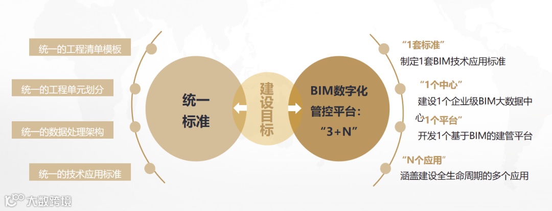 应用规划的目标是打造BIM数字化管控平台“3+N”,其中“3+N”指3个1,“1套标准”:制定1套BIM技术应用标准;“1个中心”:建设1个企业级BIM大数据中心;“1个平台”:开发1个基于BIM的建管平台;“N个应用”:涵盖建设全生命周期的多个应用。
