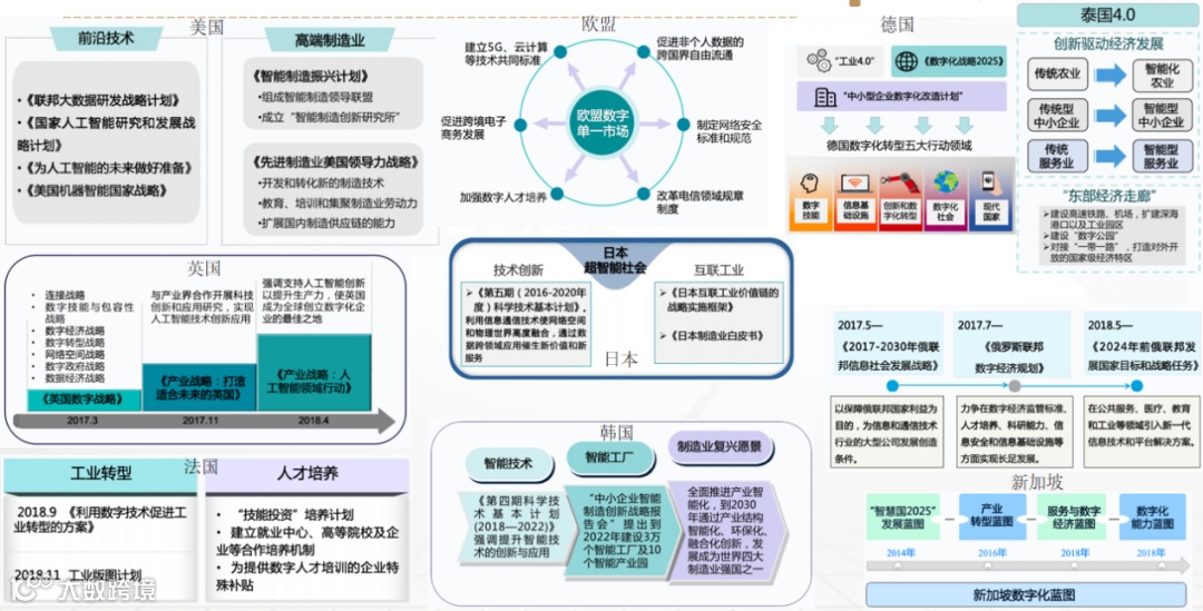 张江波博士做了大量研究发现,美国、日本、欧盟、英国、德国、法国、韩国、泰国、新加坡都不约而同地把数字化转型作为国家主要战略发展方向。