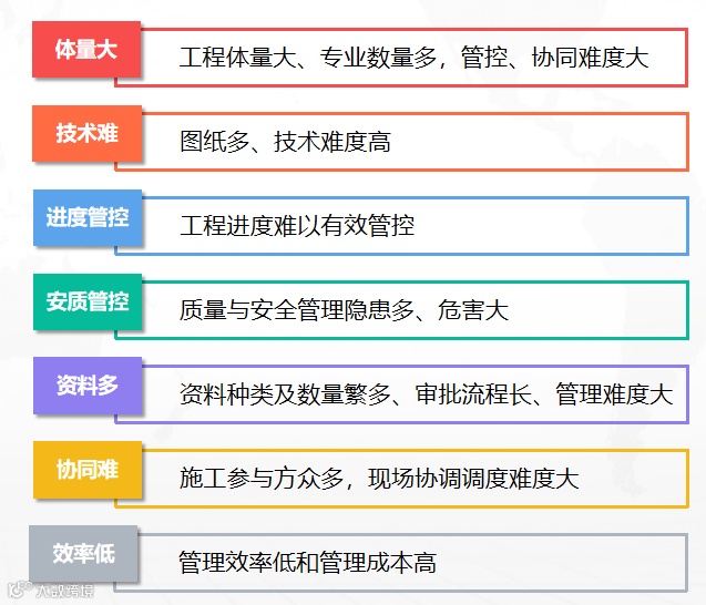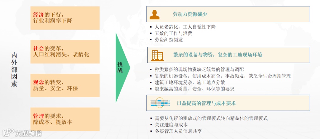 随着社会、经济、环境、技术等外部因素的变化,工程建筑行业面临着全新的挑战,主要是1、劳动力资源减少,人员老龄化,工人自觉性下降、无效的工作与浪费、劳资纠纷频发;2、繁杂的设备与物资,复杂的工地现场环境、种类繁多的现场物资缺乏统筹的管理与调配、复杂的机器设备,使用成本高企,事故频发,缺乏全生命周期管理、建筑工地环境复杂,施工地点分散、越来越高的质量、安全、环保等的要求;3、日益提高的管理与成本要求,需要从传统的粗放式的管理模式转向精益化的管理模式、关注进度与成本、各级管理人员信息共享。