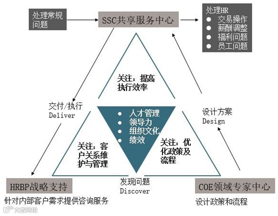 该模型通过将人力资源中的人力资本工作与事务性工作进行分开处理,将人力资源管理转变为业务导向,同时也使得人力资源管理与各部门之间的关系变得更加清晰、条理。