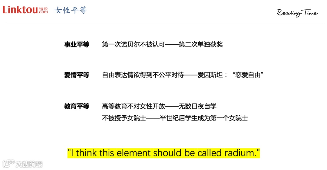 直到8几年后,玛丽独自获得了诺贝尔化学奖才打破质疑,向当时的世人证明,女性也可以独自做科研工作。