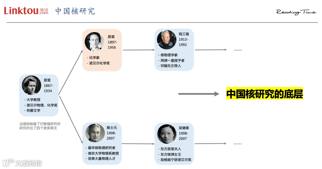 玛丽的大女儿,艾莱娜·约里奥-居里也培养了一个中国学生,叫钱三强。 后来钱三强成了中国两弹元勋。邓稼先都是钱三强推荐的。钱三强的夫人何泽慧,也是核物理学家,推动我国高能物理研究的大牛人物。
