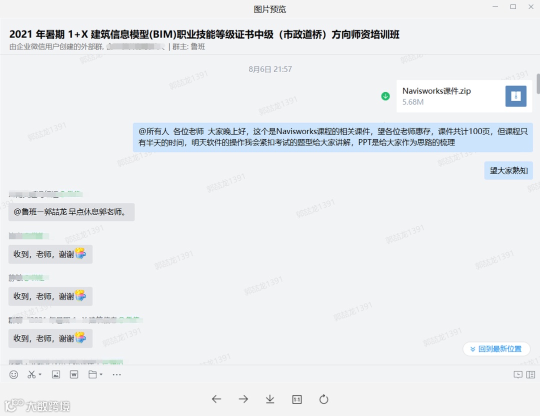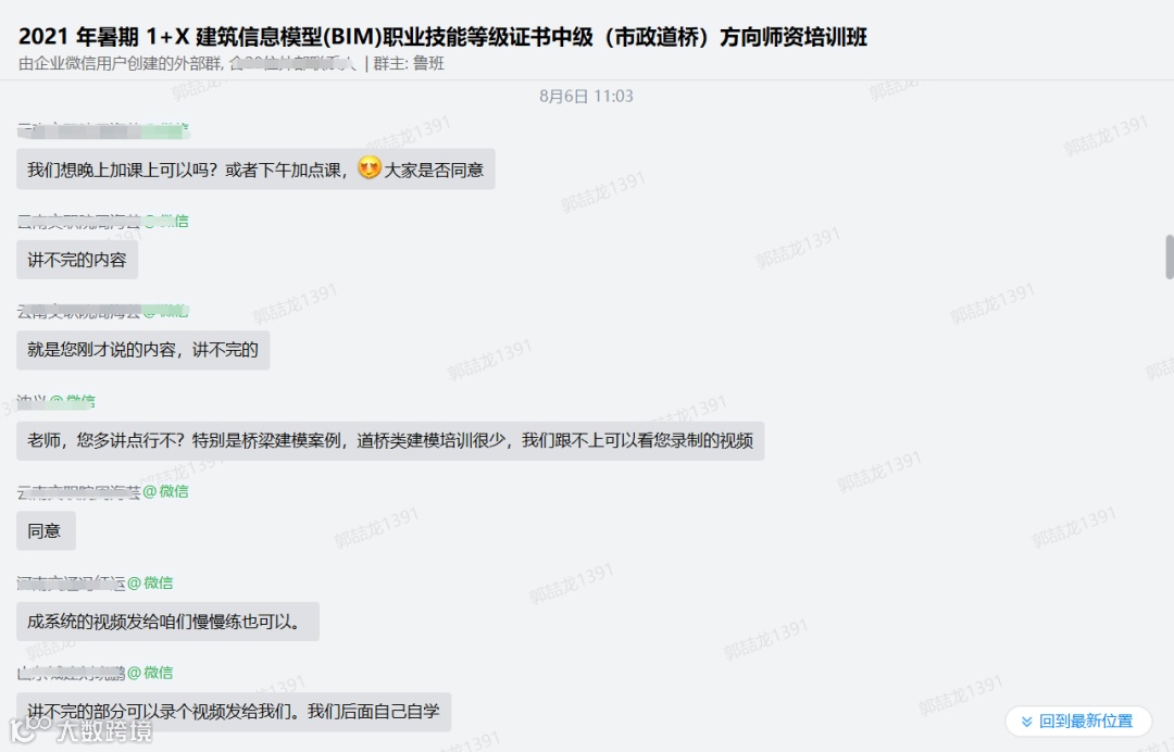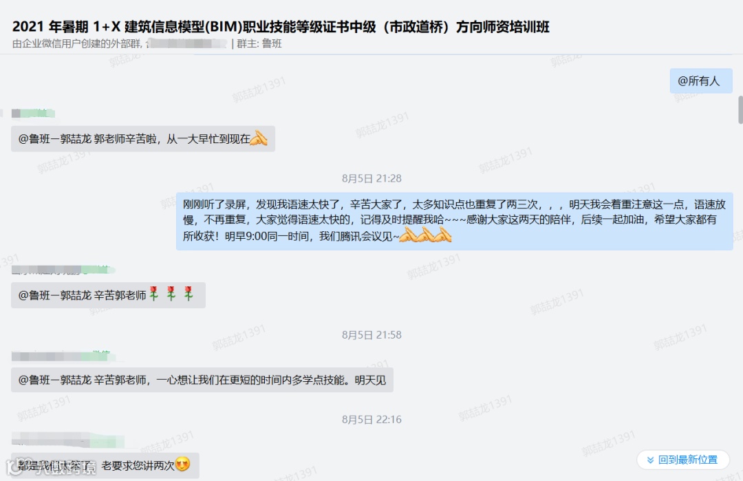 为期七天的1+X 建筑信息模型(BIM)职业技能等级证书中级(市政道桥)方向的培训,重点围绕Revit操作技能培训、Navisworks操作技能培训、鲁班场布、鲁班工场(基建版)、“1+X”市政道桥真题解析等维度逐一开讲。培训期间,讲师通过与学员实时互动、课后观看视频练习、全天在线答疑,帮助学员在软件实操、考试理解、人才培养等维度有了更高的认识与更深刻的理解。