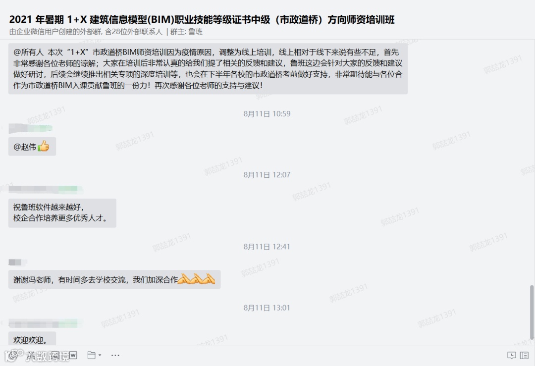 2021年8月4日-10日,由廊坊市中科建筑产业化创新研究中心主办、鲁班软件股份有限公司、贵州交通职业技术学院、北京建科建研科技有限公司承办的“2021年暑期 1+X 建筑信息模型(BIM)职业技能等级证书中级(市政道桥)方向师资培训班”圆满闭幕。作为首期七天不间断、全链路(市政道桥)方向的线上授课与互动实操培训,本次培训得到了相关领导与参训学员的高度认可。
