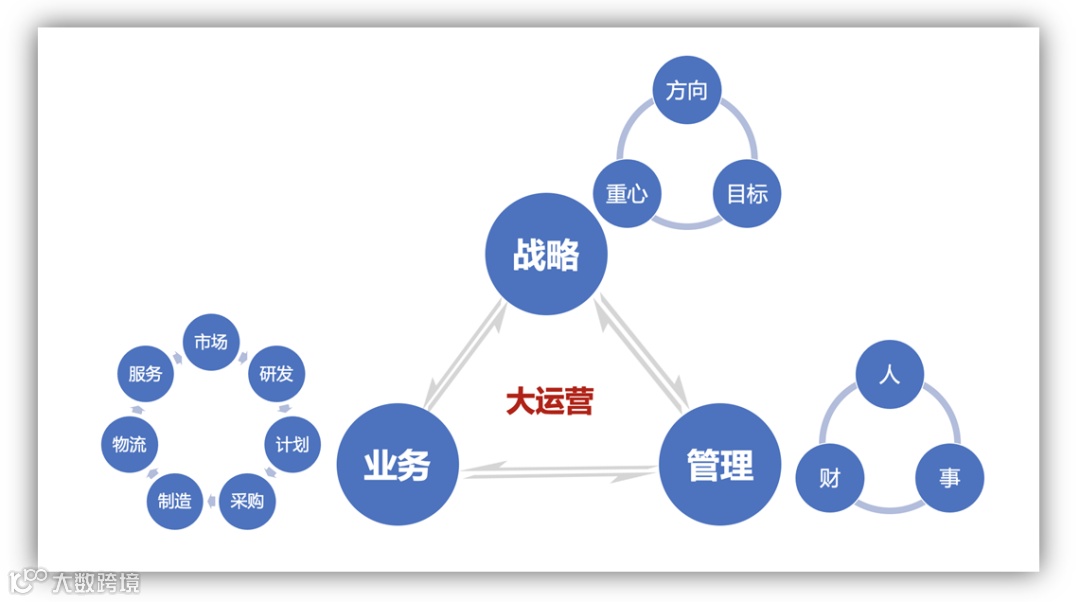 大运营,是指美的怎么把战略、业务、管理,这三者拉通的,互相之间、以及各自是如何运作的。