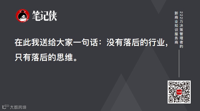 在此我送给大家一句话:没有落后的行业,只有落后的思维。