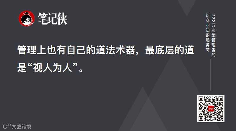 同样,管理上也有自己的道法术器,最底层的道是“视人为人”。不管东方古老的儒家,还是西方的大师,都有各种管理方法,甚至形成了管理学上的管理森林。他们都有自己的理论主张,放到一定场景下,它们都自成一体。