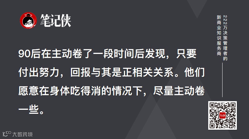 同时,90后在“付出与收入不匹配”的选项上,人数是最少的。这说明90后在主动卷了一段时间后发现,只要付出努力,回报与其是正相关关系。他们愿意在身体吃得消的情况下,尽量主动卷一些。