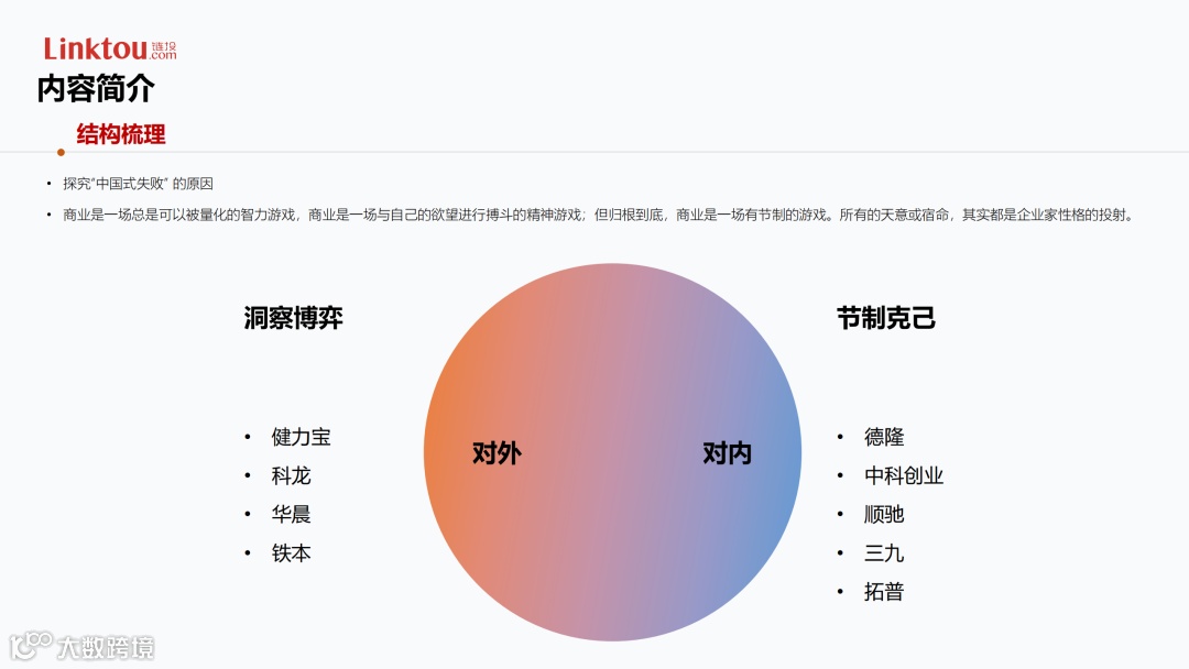 《大败局1》告诉大家产品是企业的第一生命力,《大败局2》则是讲述了中国经济市场快速发展的过程中,在中国遍地机会的市场下,由于企业家没有平衡融资、拓张、盈利的节奏,导致了企业的失败。