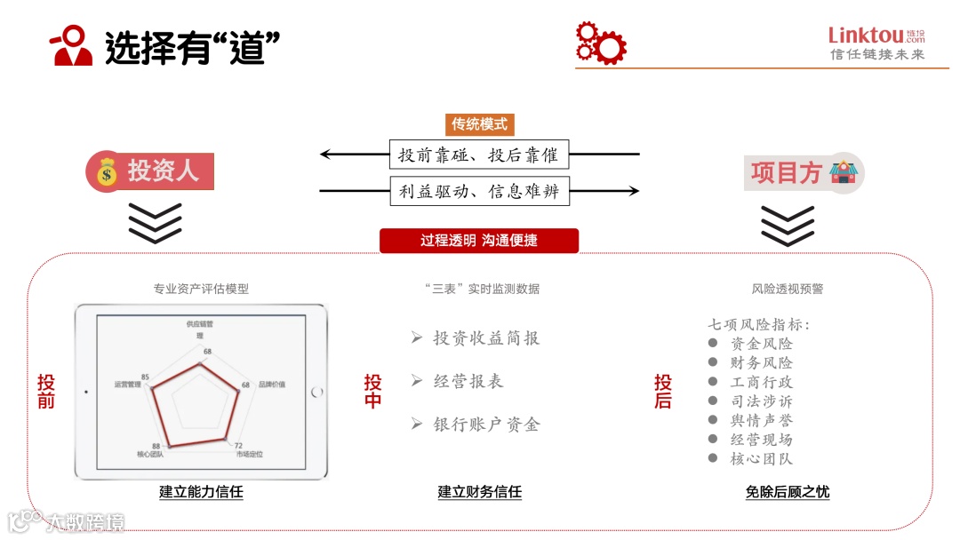 数字科技工具--投前有模型、投中有三表、投后有管理。链投从投前选择、投中经营、投后管理三大度助您把握投资!