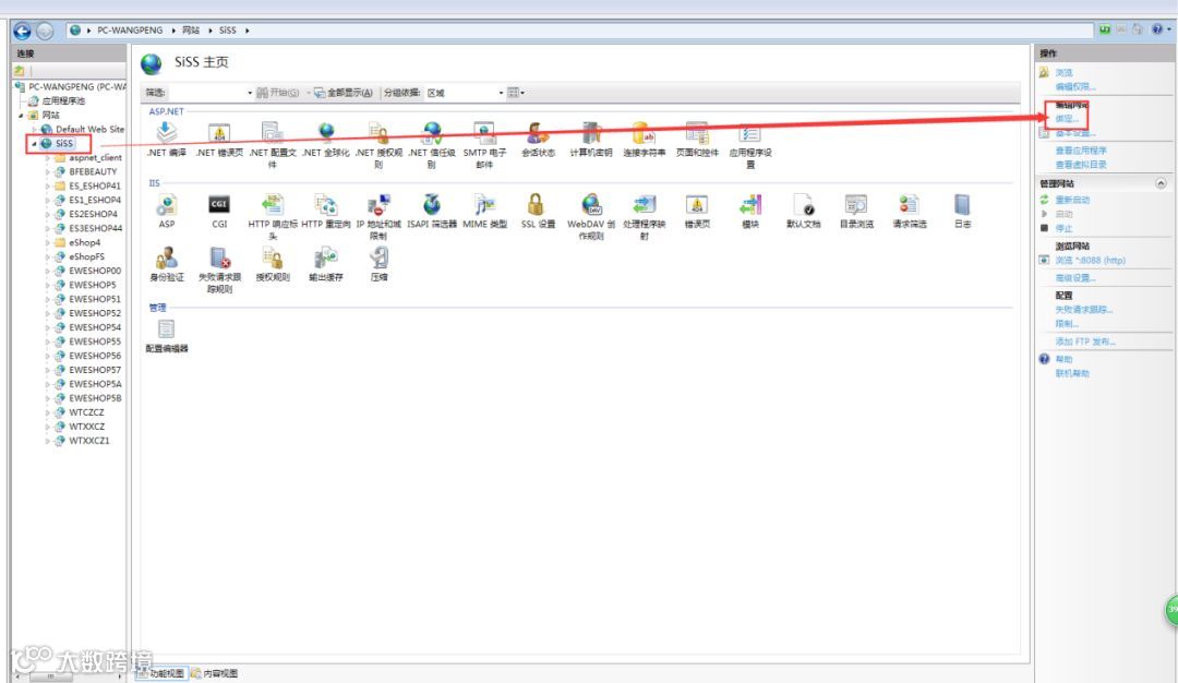 2.2 选中网站下对应站点SISS在右侧选项卡选择“绑定”。