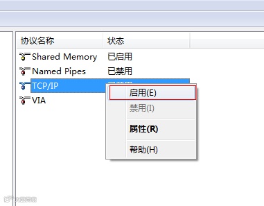 4. 如果TCP/IP未启用,则在TCP/IP上右击,选择启用。