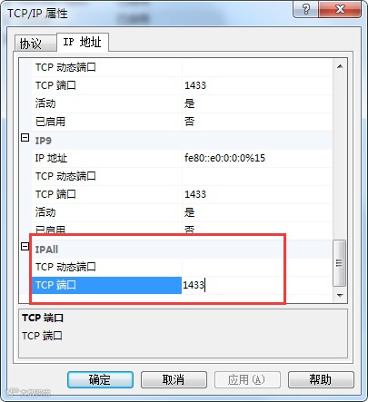 3. 修改端口号。在TCP/IP上右击,选择属性,打开属性对话框,选择属性对话框的IP协议,在对话框的最下面IPALL找到TCP动态端口,将原来的无论是什么值,都改成你想要的端口号,通常国际上默认1433,点击确认。