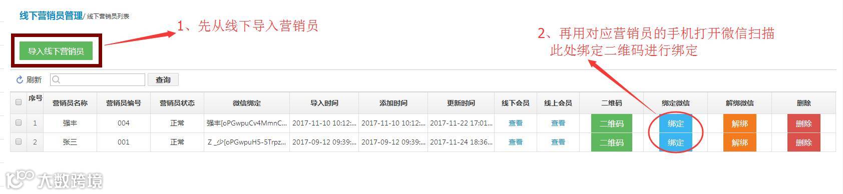 2.再到微商店后台导入线下营销员,并生成绑定微信二维码。对应的营销员使用微信扫描二维码进行绑定,之后在会员中心界面即会显示“营销员”信息。