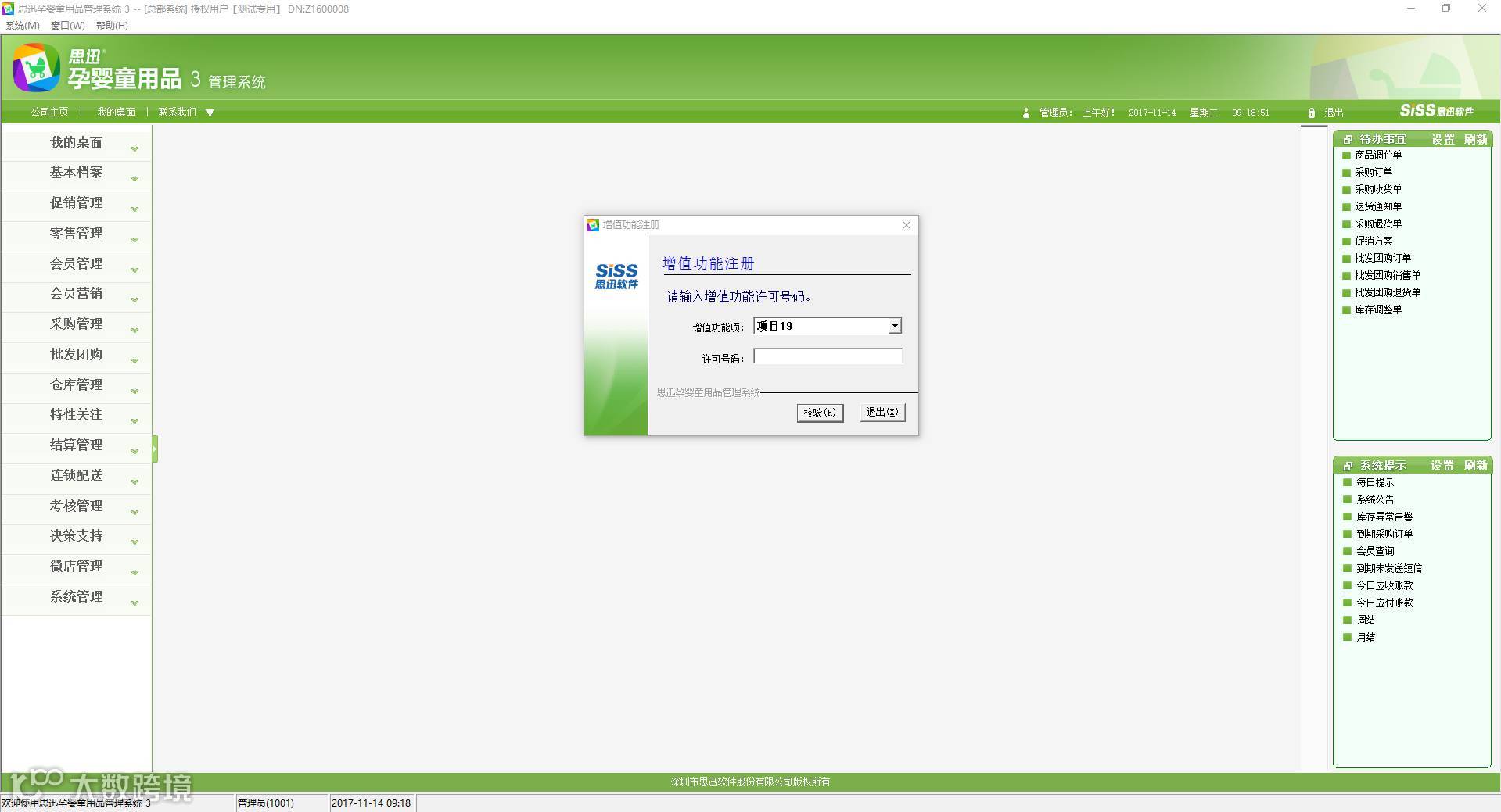 答:以孕婴童3为例。代理商需联系我司渠道获取注册码,进入总部后台系统,点击“帮助”——“增值功能”,选择增值项目编号19,输入注册码进行注册即可。如下图: