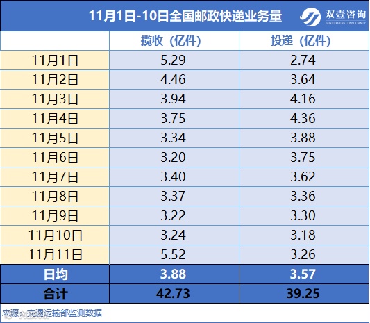 保通保畅工作领导小组办公室监测汇总数据显示,11月1-11日邮政快递揽收量约42.73亿件,日均3.88亿件;投递量约39.25亿件,日均3.57亿件。