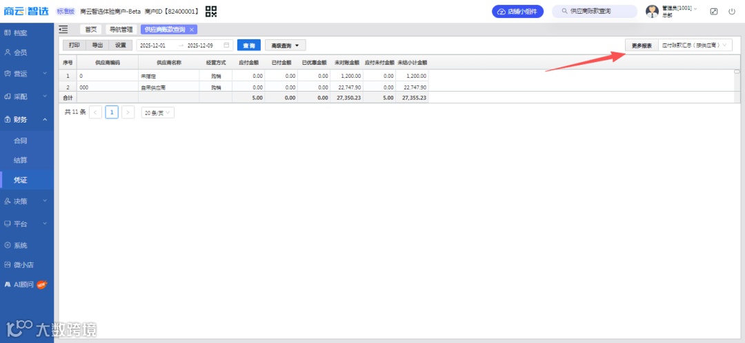 ●【供应商账款查询】新增【应付账款汇总(按供应商)】子报表,按供应商维度统计应付、已付、未付等金额信息,账款管理更清晰。