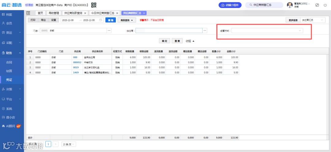 ● 新增【供应商汇总】子报表,且支持按 “经营方式” 筛选查询,销售数据统计更精准。