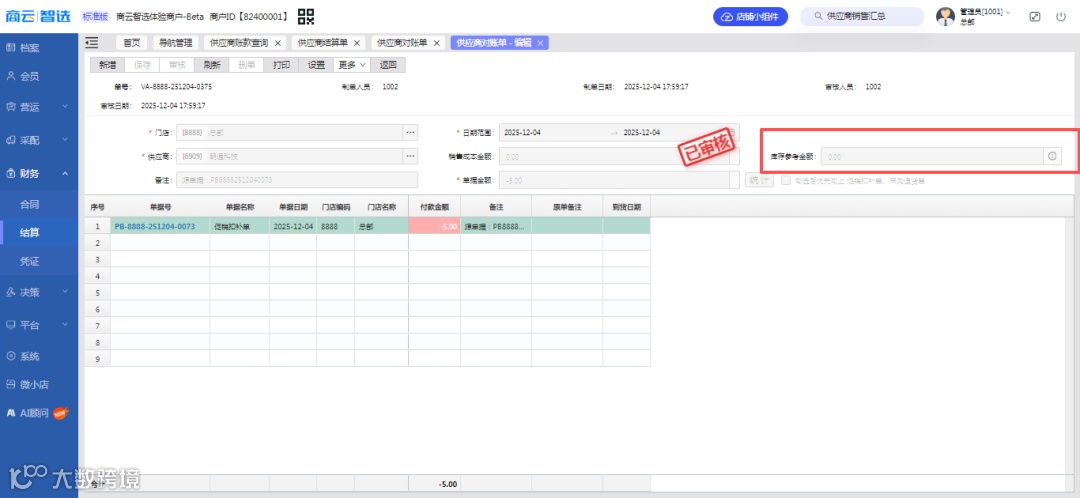 ●【供应商对账单】明细界面新增 “库存参考金额”,提供更多对账参考维度,提升对账准确性。
