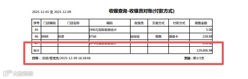 ●【收银查询】子报表优化,【收银员对账(付款方式)】打印时新增金额合计统计项,对账更便捷。