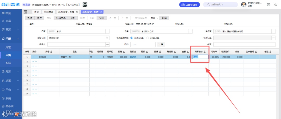 ●【采购收货单】增加“调零售价”信息列,收货时可直接调整售价,变价一步到位。