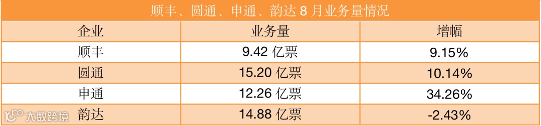 9月19日,顺丰、圆通、申通、韵达发布8月份业绩简报。