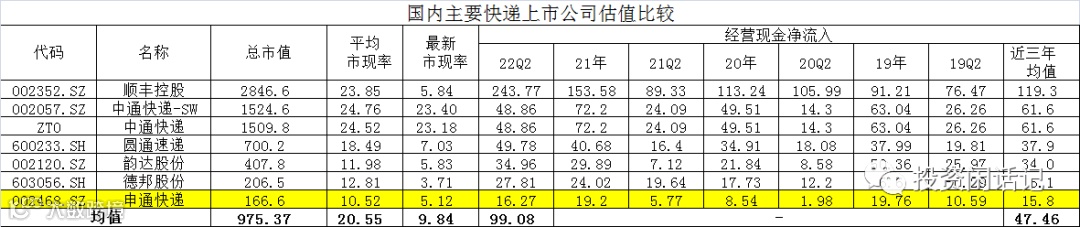 同业平均静态市净率(市值/过往3年经营现金净流入)为20.55倍,其中:中通、顺丰最高,分别为24.76倍和23.85倍,申通最低10.52倍,较行业均值折让56%。