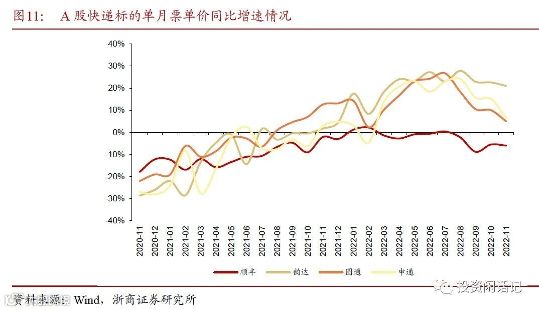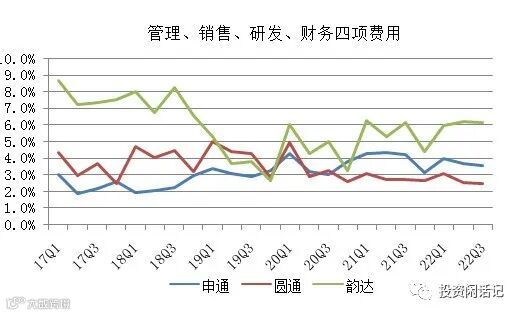 申通的管理、销售、研发、财务四项费用自2020Q1走高后,22年呈现下降趋势,从一季度的4.0%下降到三季度的3.6%,尽管仍高于圆通的2.5%,但已明显低于韵达的6.1%。
