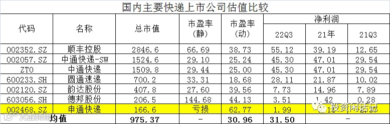 同业平均市净率为2.81倍,其中,顺丰、德邦、中通较高分别为3.35倍、3.31倍和2.97倍,申通最低只有2.06倍,较行业均值折让26.7%。