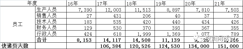 随着业务发展,申通的快递员人数从2017年的10.6万人稳步增加至2021年的15.1万人,但是随着阿里管理团队的入主,申通公司员工从2018年的1.45万人持续下降至2021年的0.91万人,降幅达37.2%。