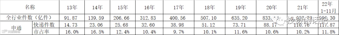 因为种种原因,作为民营快递开山鼻祖的申通快递,在业务发展上一度被“三通一达”其他公司所抛下。阿里新管理团队入主申通以来,实施了“三年百亿”产能提升计划,因此尽管快递行业总体增速放缓,但今年申通当月快递业务收入增速已连续9 个月领跑,特别是22年8月市场占有率提高至13%,创下自2016年12月份上市以来单月最高纪录。前三季度申通营收同比增速高达42.4%,申通快递重新燃起回归快递行业第一方阵的希望。