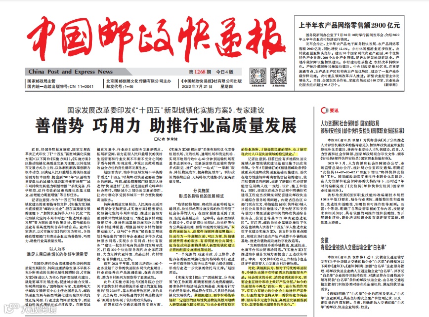 记者注意到,作为“ 十四五”时期新型城镇化建设的重要指导性文件,《实施方案》虽未直接提及“ 邮政快递业”,但在高质量发展的主题下,“ 加快农业转移人口市民化”“ 优化城镇化空间布局和形态”“ 推进城乡融合发展”等方面的诸多政策举措,都与邮政快递业有着高度的契合点和结合点。业内专家表示,以《实施方案》的印发为契机,各级邮政管理部门和寄递企业应当善借势,巧用力,助推行业高质量发展。